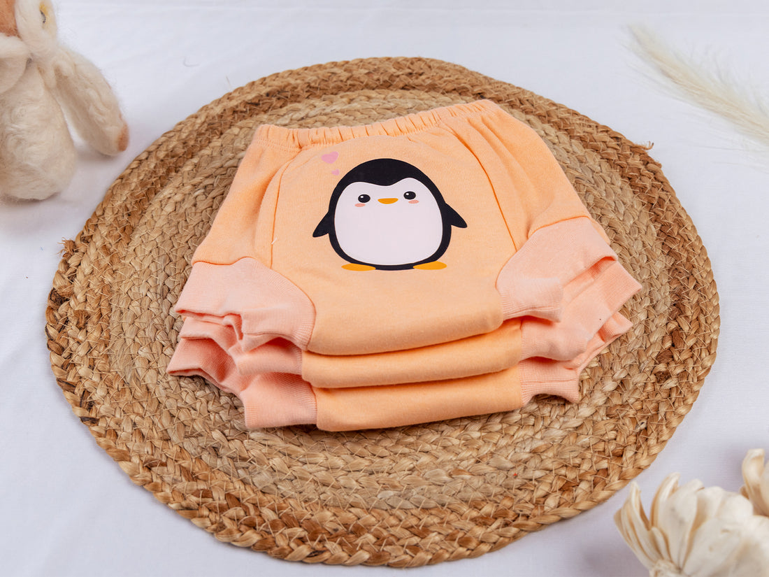 Soft and comfy peach-colored baby shorts featuring a cute penguin print, designed with an elastic...