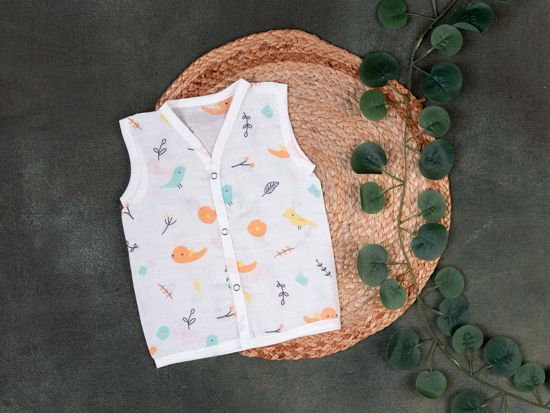 This charming sleeveless vest features a soft white base with delightful nature-inspired prints colorful birds...