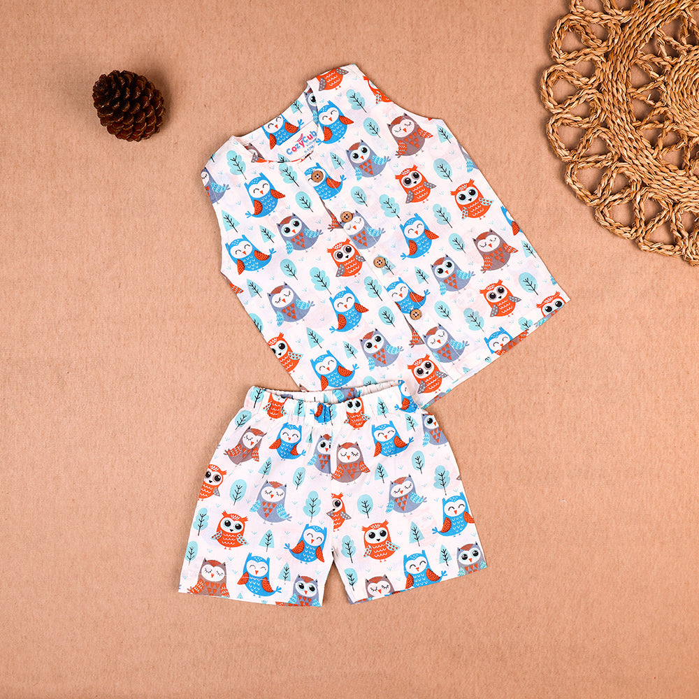 Cute Owl Print Cotton Jabla & Shorts Co-ord Set for Boys