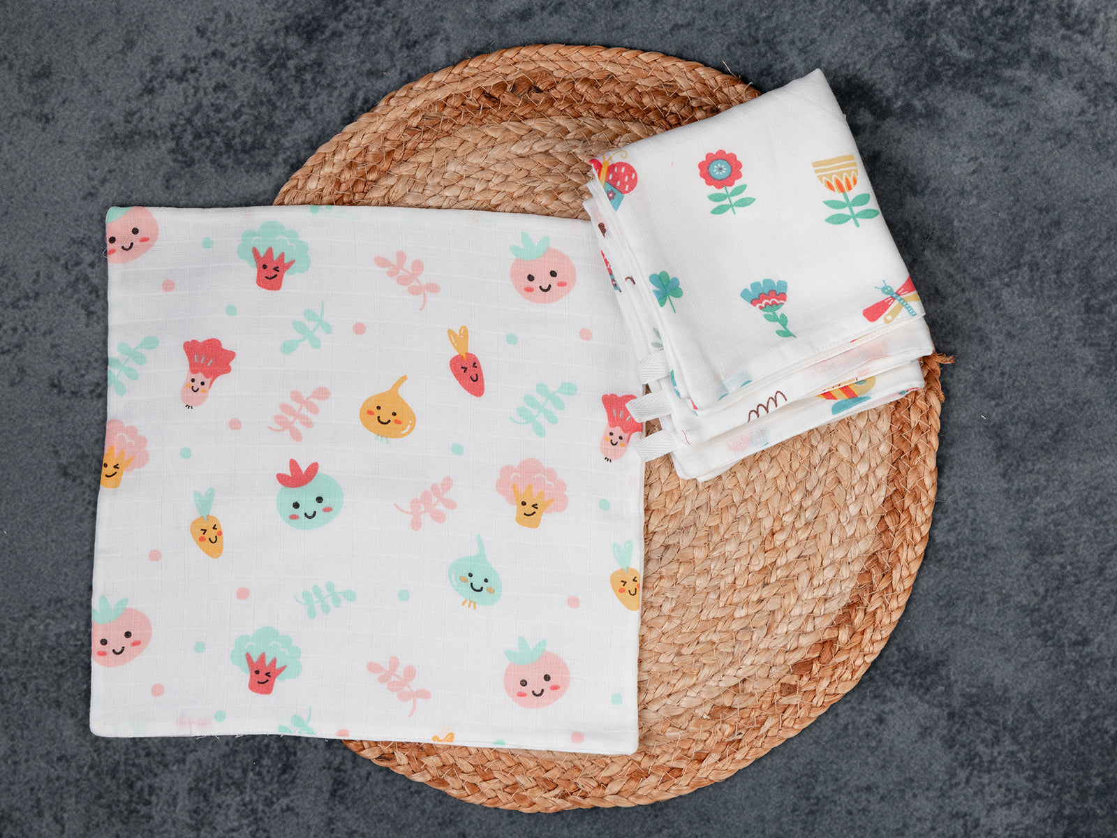 Premium 4-layer baby burp cloth collection featuring adorable kawaii-style vegetables with the sweetest smiling faces in soft coral, mint, and golden yellow tones. Four-layer construction provides exceptional absorbency and superior protection during feeding time while remaining soft and comfortable. Crafted from high-quality muslin cotton that's ultra-gentle on baby's delicate skin. The cheerful veggie characters including happy carrots, broccoli, onions, and radishes make healthy eating fun from day one. Durable, machine washable, and designed to soften with each wash. These delightful burp cloths combine maximum functionality with playful design – perfect for health-conscious, style-savvy parents!