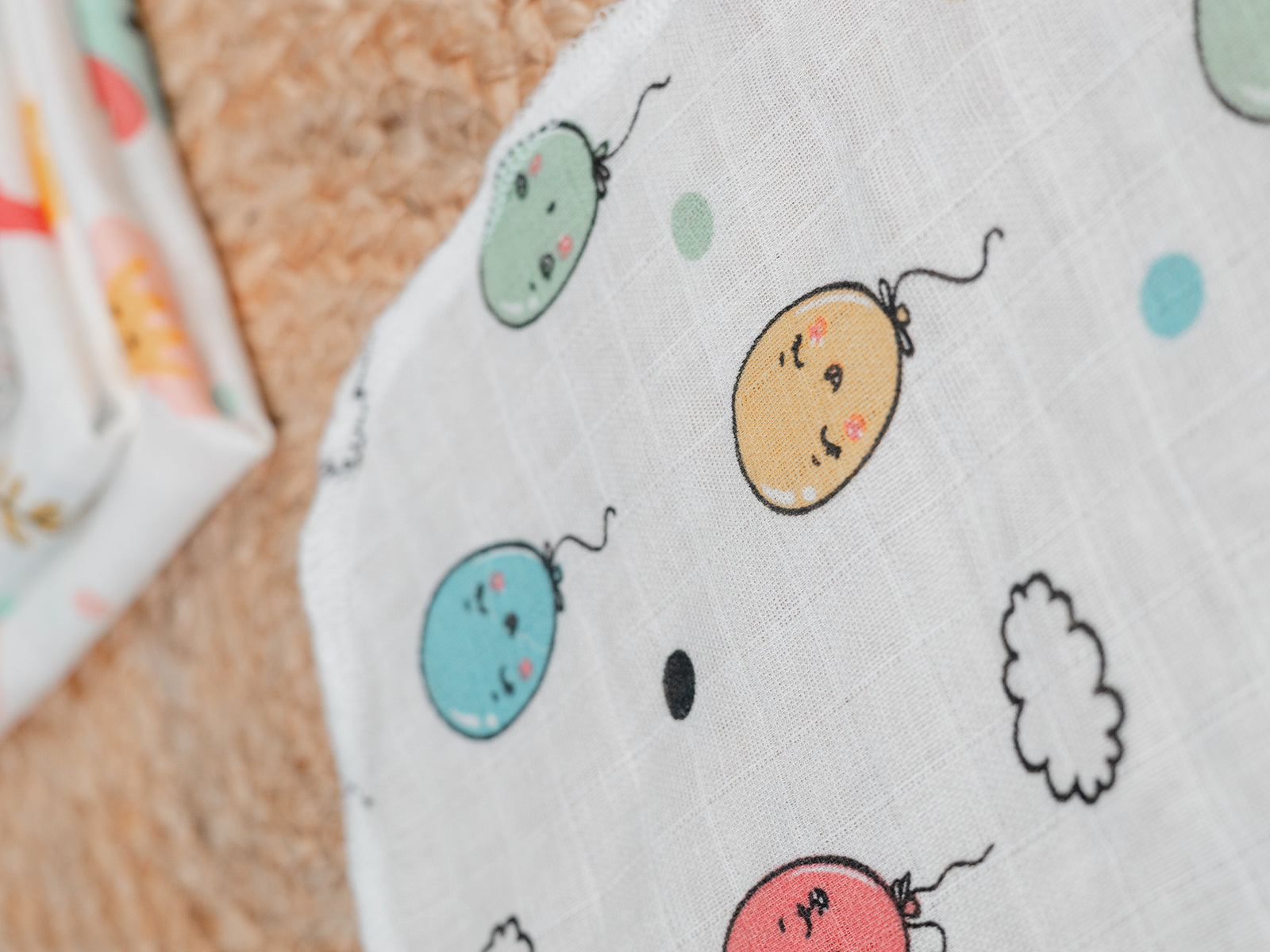 Premium 2-layer baby burp cloth collection featuring adorable kawaii balloon faces floating among fluffy clouds in soft pastels of coral, mint, sage, and butter yellow. Double-layered construction provides superior absorbency while remaining lightweight and breathable for baby's comfort. The sweet balloon characters with expressive faces add a touch of whimsy to everyday feeding routines. Soft muslin cotton is gentle on delicate skin and becomes even softer with each wash. These versatile, durable burp cloths