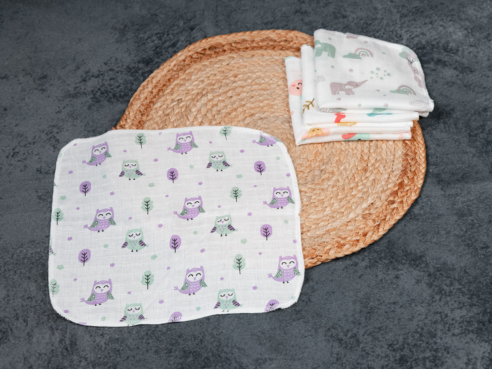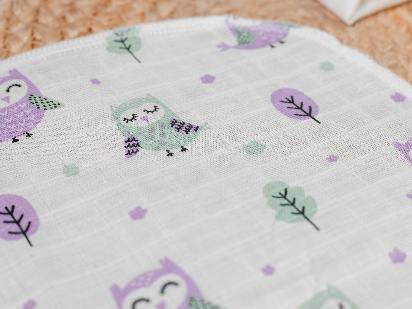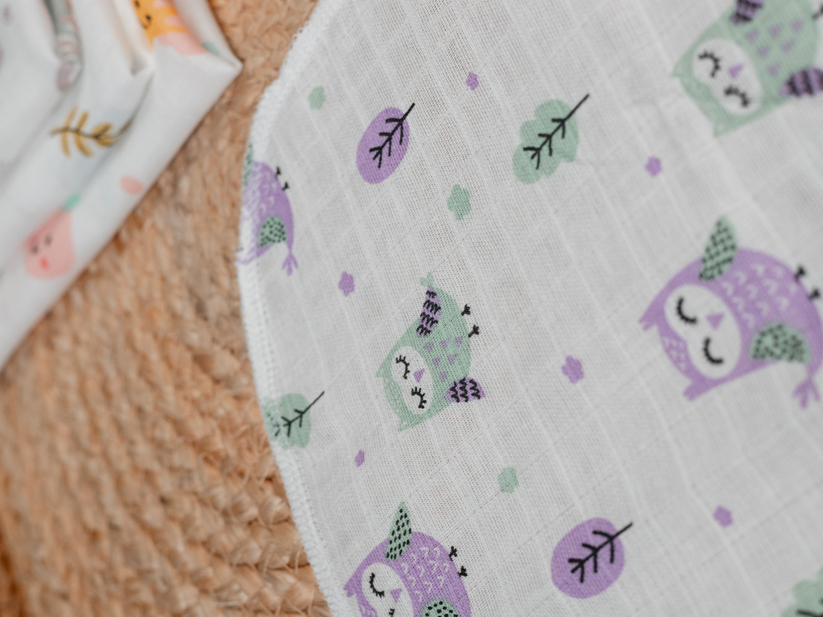 Enchanting baby burp cloth collection featuring adorable sleepy owls in dreamy lavender and mint green tones, nestled among whimsical trees and tiny dots. Crafted from soft, breathable muslin cotton that's exceptionally absorbent and gentle on baby's delicate skin. The sweet owl characters with closed eyes create a peaceful, calming aesthetic perfect for bedtime feeding routines. Lightweight yet durable construction stands up to frequent washing while maintaining softness. These charming burp cloths combine nursery-worthy style with essential functionality – an ideal gift for parents who love nature-inspired baby accessories!