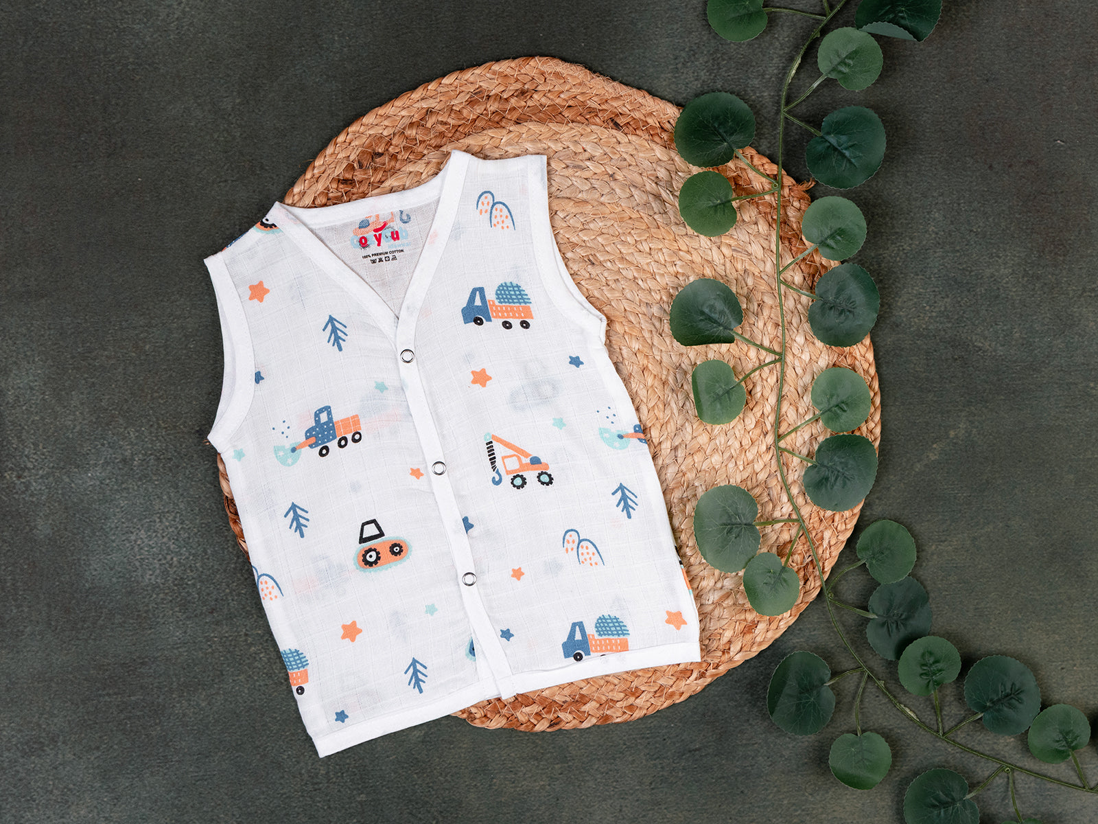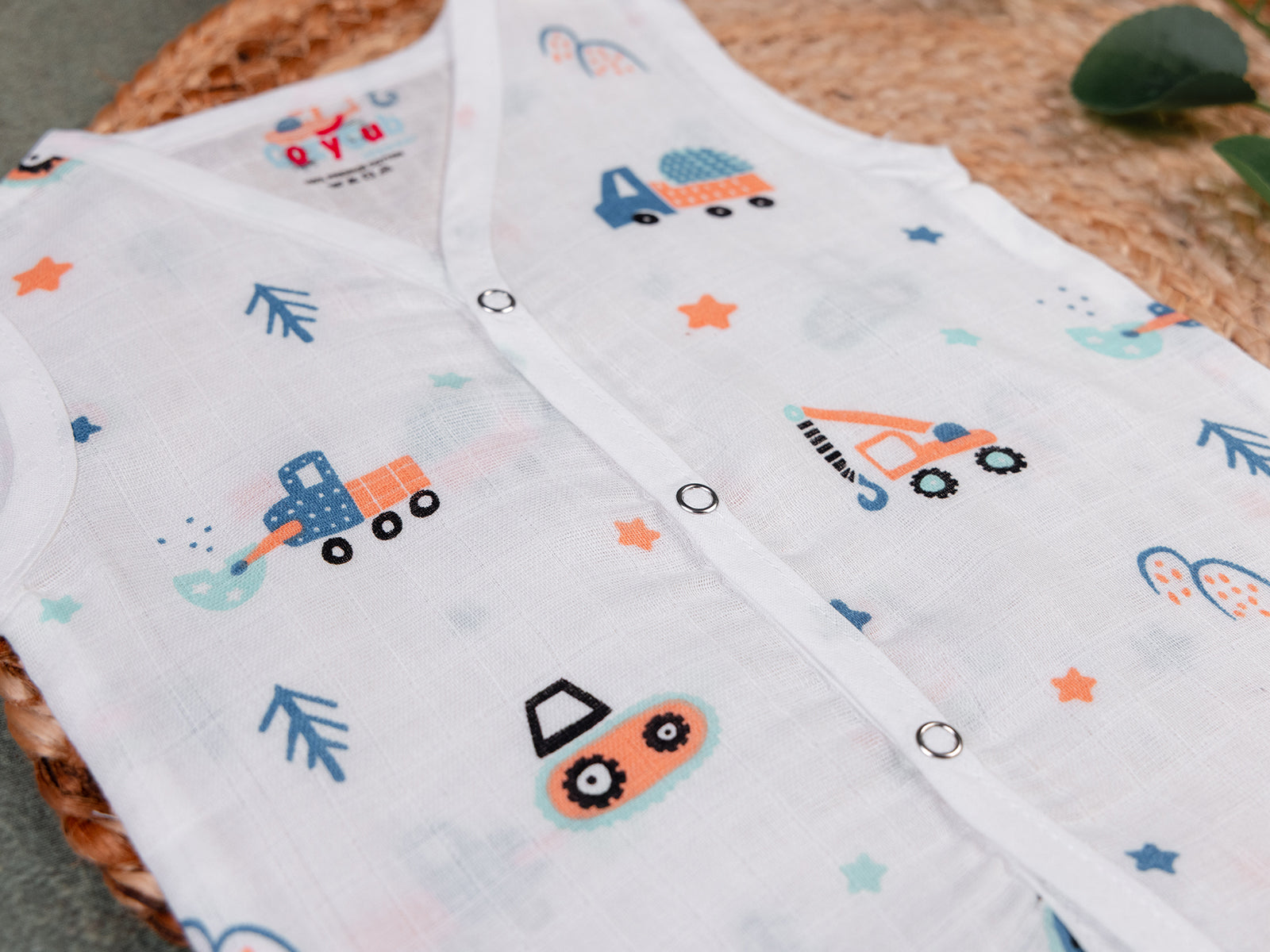 This adorable sleeveless baby vest showcases a fun construction site pattern featuring colorful trucks, cranes, dump trucks, and playful stars in cheerful blue colors. Crafted from soft, lightweight fabric that ensures optimal airflow and comfort for your busy little builder. The convenient snap-button front closure provides easy access for quick dressing and seamless diaper changes throughout the day. Perfect for active play or peaceful naps, this charming vehicle-themed vest combines construction site excitement