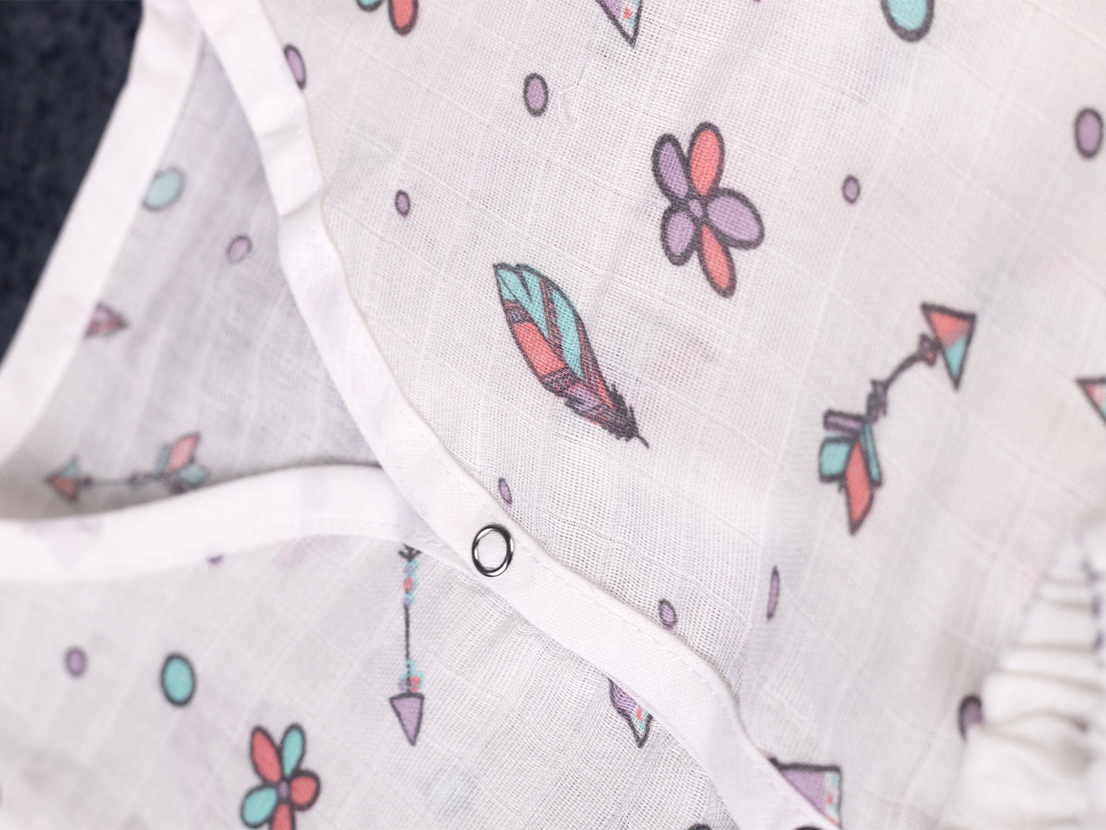 Soft muslin cotton full-sleeve night suit featuring trendy boho elements including geometric triangles, arrows, feathers, and flowers in soft purple, coral, and teal tones. Button-front top with matching full-length pants for comfortable all-night sleep. Ultra-lightweight and breathable muslin fabric perfect for sensitive skin and temperature regulation. Easy-care material that's machine washable and becomes softer with each wash. Unisex design suitable for both boys and girls.