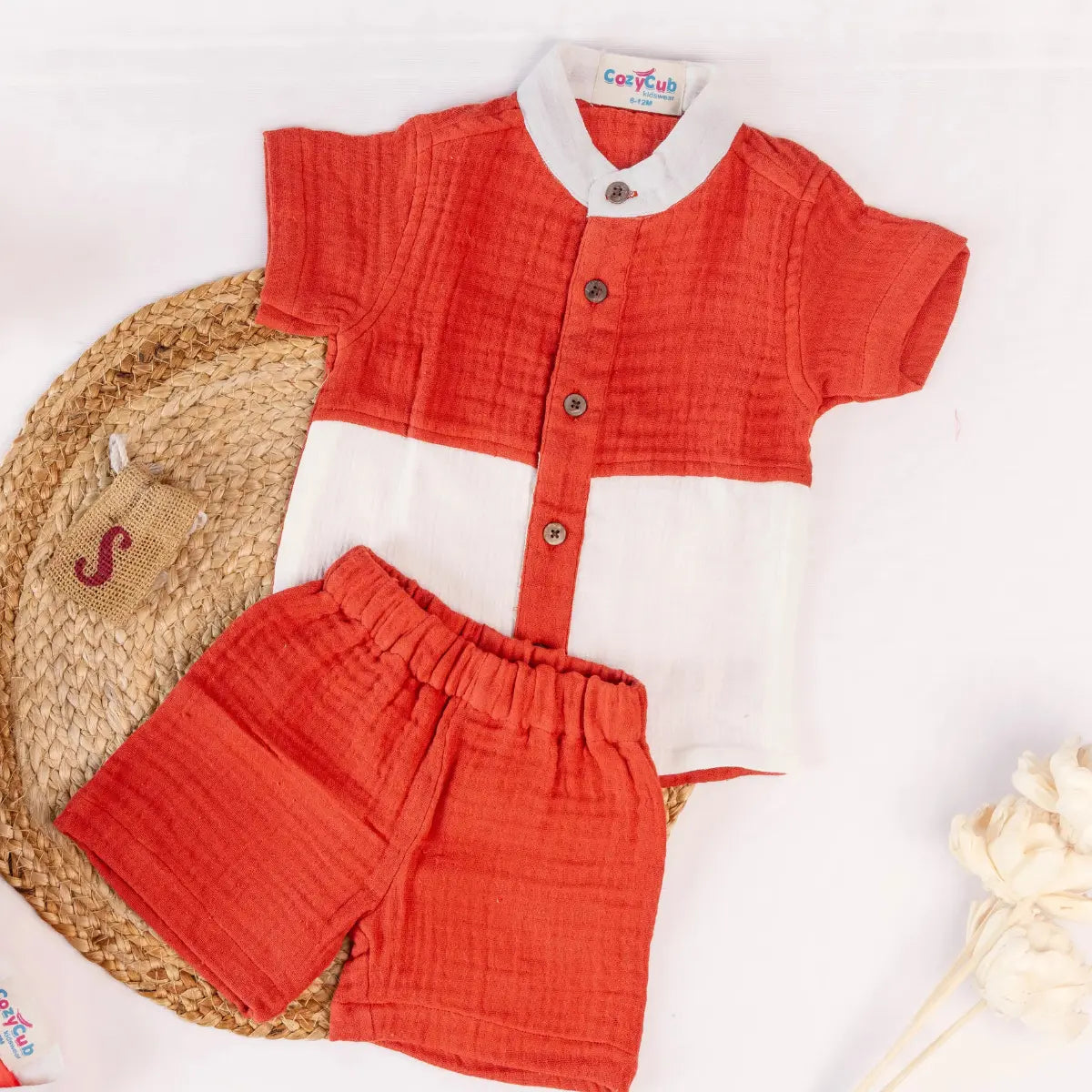 Farm Adventure Set by CozyCub_Kids Made from soft 100% cotton in crisp white and rich chocolate brown, this charming two-piece set features brown tractor and tree prints scattered throughout. The classic button-down shirt pairs perfectly with matching elastic waist shorts. Perfect for little farmers who love comfortable play and countryside-inspired style.