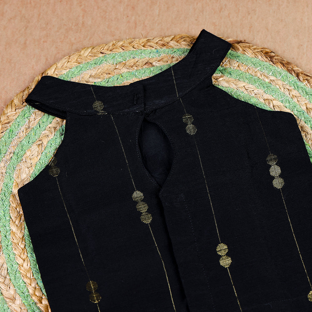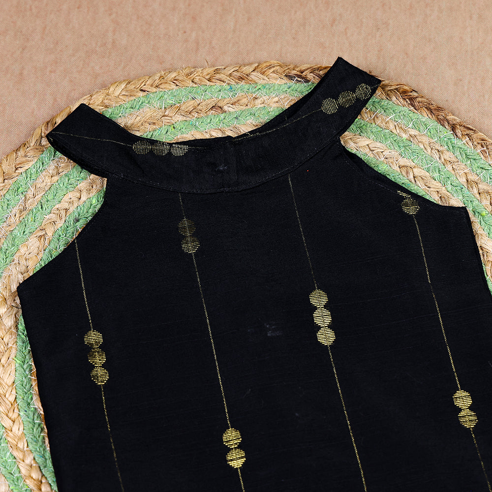 Embrace timeless elegance with this sophisticated raw silk set featuring a sleek black moon collar top adorned with delicate vertical embellishments. The vibrant fuchsia pink pleated skirt with golden checkered detailing creates a stunning contrast that exudes festive charm. Crafted from premium raw silk, this ensemble offers both comfort and style, making it ideal for weddings, traditional celebrations, or special family gatherings. The bold color combination and refined design elements make this a wardrobe essential for your little trendsetter.