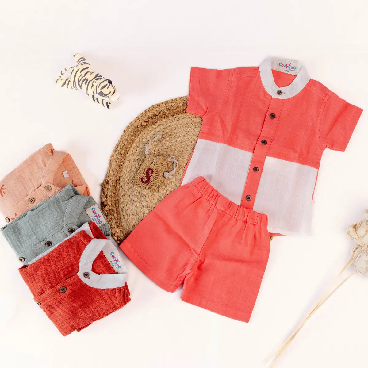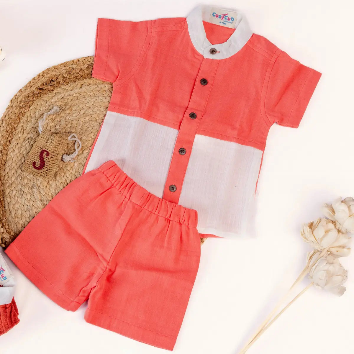 Coral Colorblock Set by CozyCub_Kids Made from soft, breathable linen in vibrant coral and cream, this stylish two-piece set features a classic colorblock design with wooden button details. The button-down shirt pairs perfectly with matching elastic waist shorts. Perfect for little trendsetters who love comfortable play and modern color-blocked style.