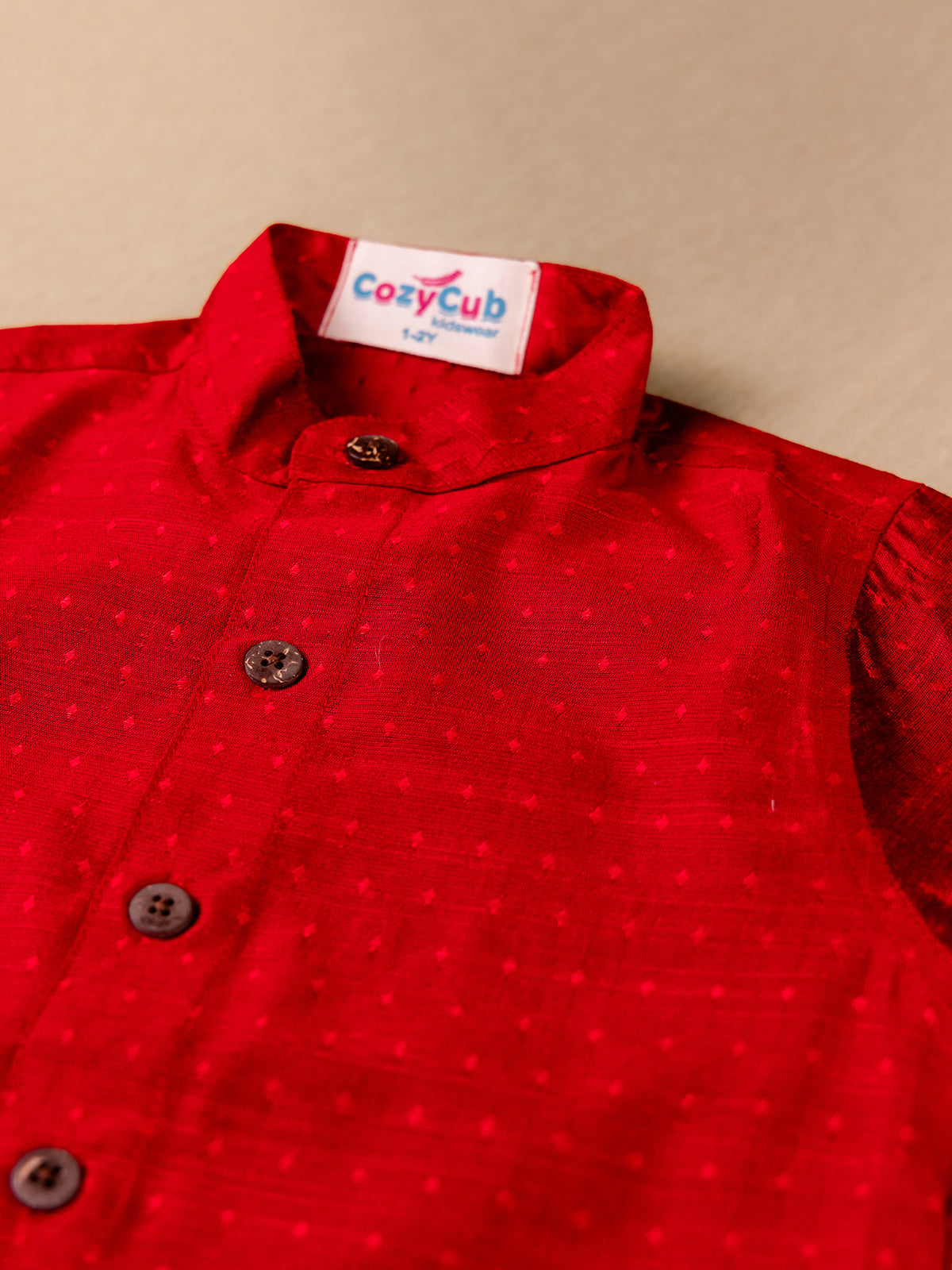 Embrace traditional elegance with this rich maroon shirt featuring decorative button detailing on the chest for an authentic ethnic look. The deep burgundy fabric creates a regal appearance perfect for festivals, weddings, and cultural celebrations. Paired with a crisp white dhoti adorned with traditional golden borders, this ensemble captures authentic Indian heritage styling. The comfortable cotton construction and relaxed fit ensure your little one stays at ease during extended wear. Easy-to-dress design with practical elements makes this set ideal for both special occasions and cultural events. A timeless ethnic choice that combines traditional charm with modern comfort for your young prince's wardrobe.