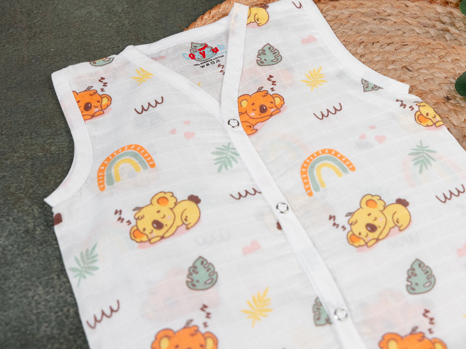 This adorable sleeveless vest features a soft white base with charming safari animal prints—sleepy koalas, playful lions, and colorful tropical elements like pineapples and leaves, accented with whimsical "zzz" sleep motifs. Made from soft, breathable cotton with convenient snap-button closure, it's perfect for jungle adventures and comfortable everyday wear. Designed for little explorers, this delightful vest brings the wild outdoors to your child's wardrobe while keeping them cool and stylish all day