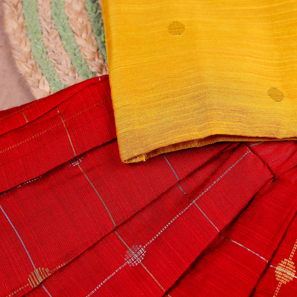 Brighten up any celebration with this cheerful raw silk ensemble featuring a vibrant yellow moon collar top adorned with white polka dots and a cute red bow accent. Paired with a striking red pleated skirt showcasing golden and silver checkered embellishments, this set radiates festive joy and playful elegance. Crafted from soft, premium raw silk for all-day comfort, this outfit is perfect for traditional celebrations, family gatherings, or festive occasions. The bold yellow and red combination creates an energetic, eye-catching look that your little one will love to wear
