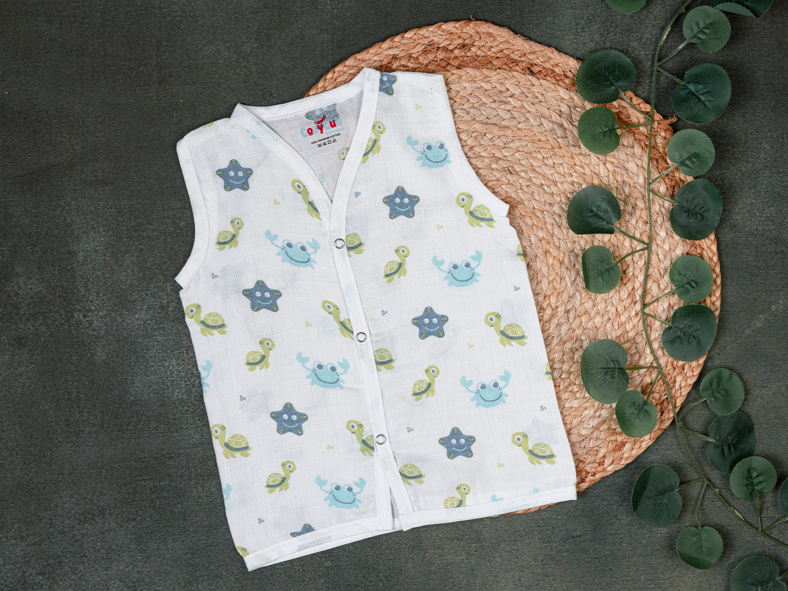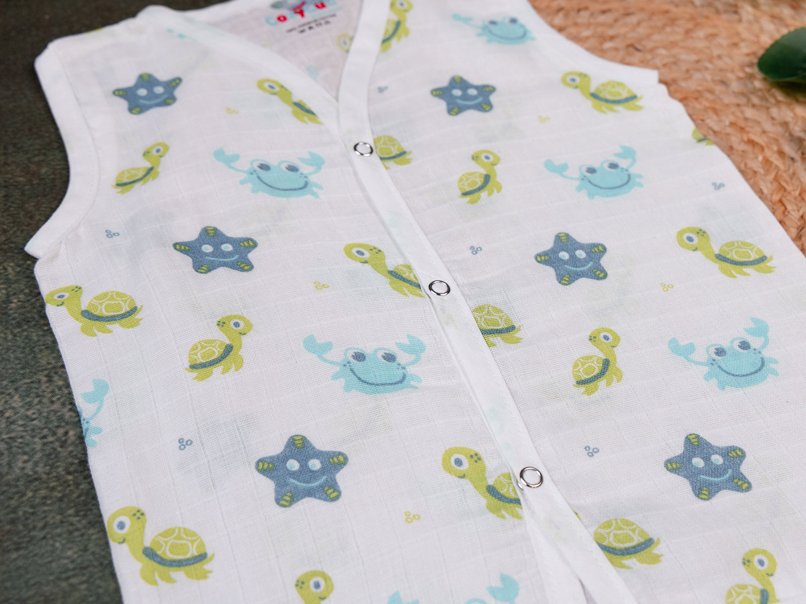 This adorable sleeveless vest features a soft white base with charming sea creature prints—friendly blue crabs, cute green turtles, and playful starfish in vibrant ocean colors of turquoise, lime green, and navy blue. Made from soft, breathable cotton with convenient snap-button closure, it's perfect for seaside adventures and comfortable everyday wear. Designed for little ocean explorers, this delightful vest brings the wonder of underwater worlds to your child's wardrobe while keeping them cool and stylish all day long.