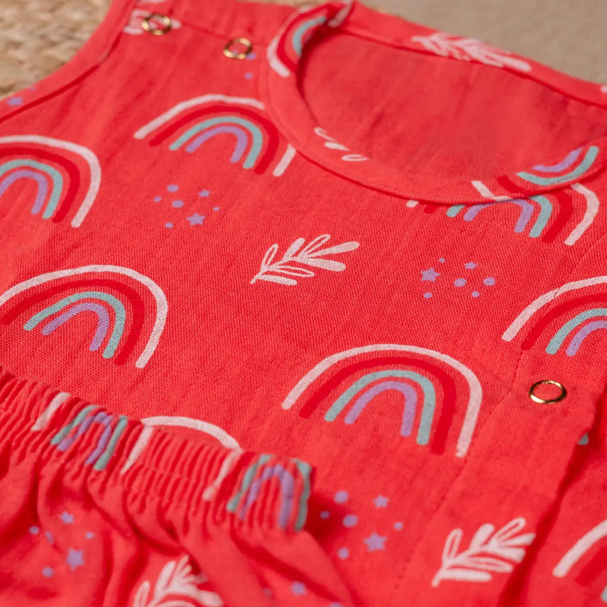Made from 100% soft cotton, this coral-pink coordinate set features vibrant rainbow and leaf prints for a playful look. The sleeveless top has stylish button details while elastic waist pants ensure flexible comfort. Lightweight and skin-friendly—perfect for playdates, outings, or home wear with effortless style.